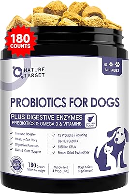 NATURE TARGET Probiotics for Dogs, 6 Billion CFUs, Freeze Dried Dog Probiotics with Prebiotics & Enzymes for Diarrhea, Gas, Vitamins & Omega 3 for Skin & Immune Health, Allergy Itch Relief, 180 Count